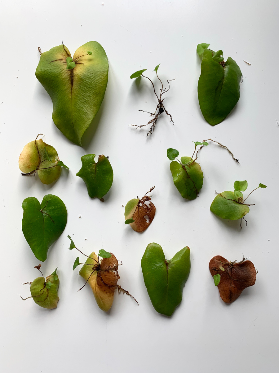 Для первого способа — отрезаю лист с деткой и укореняю его, чуть-чуть заглубив в сфагнум. Закрываю крышкой и убираю в не яркое место. В такой среде листья Хемионитиса укореняются прекрасно, обрастая зеленым ковром поверх мха. Старые (материнские) листья со временем сгнивают, тем самым обеспечивая дополнительной питательной средой будущее поколение Хемионититсов.