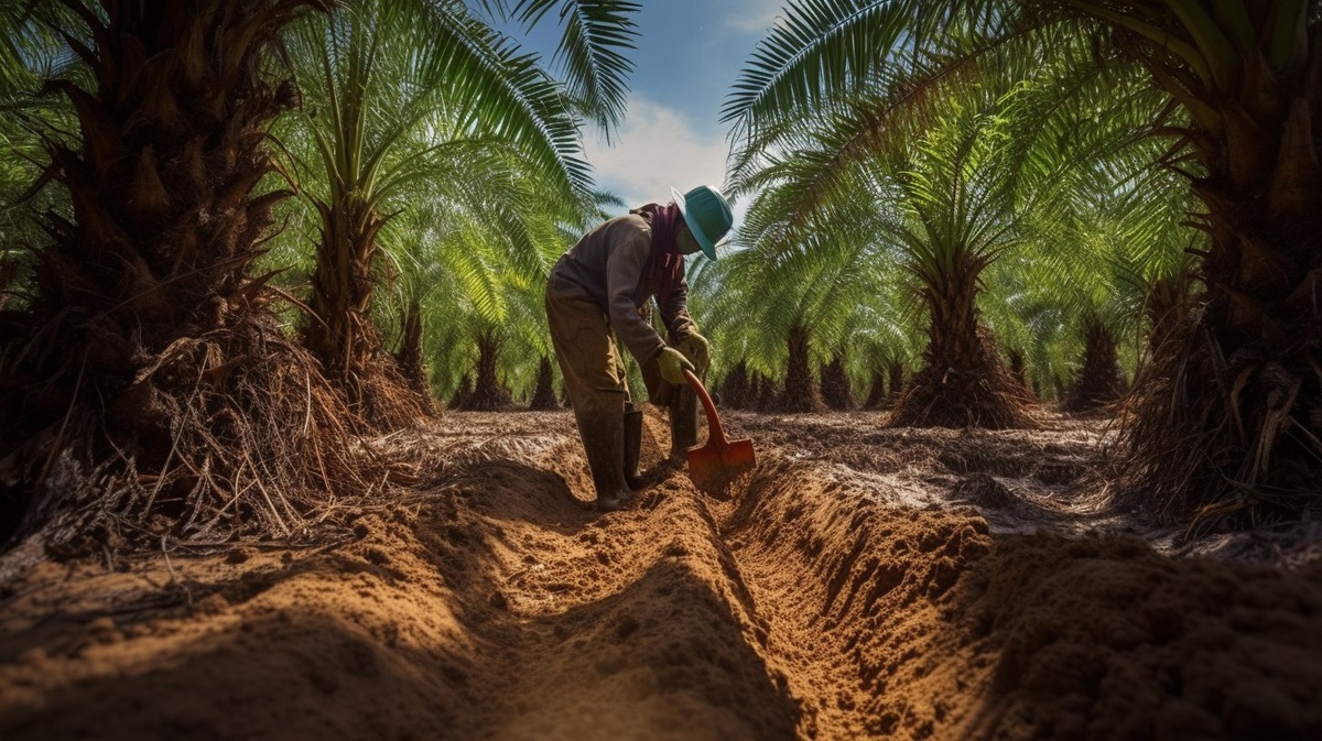 Создано на основе запроса: An oil palm plantation worker applying fertilizer at the base of a palm tree, wearing a wide-brimmed hat and
