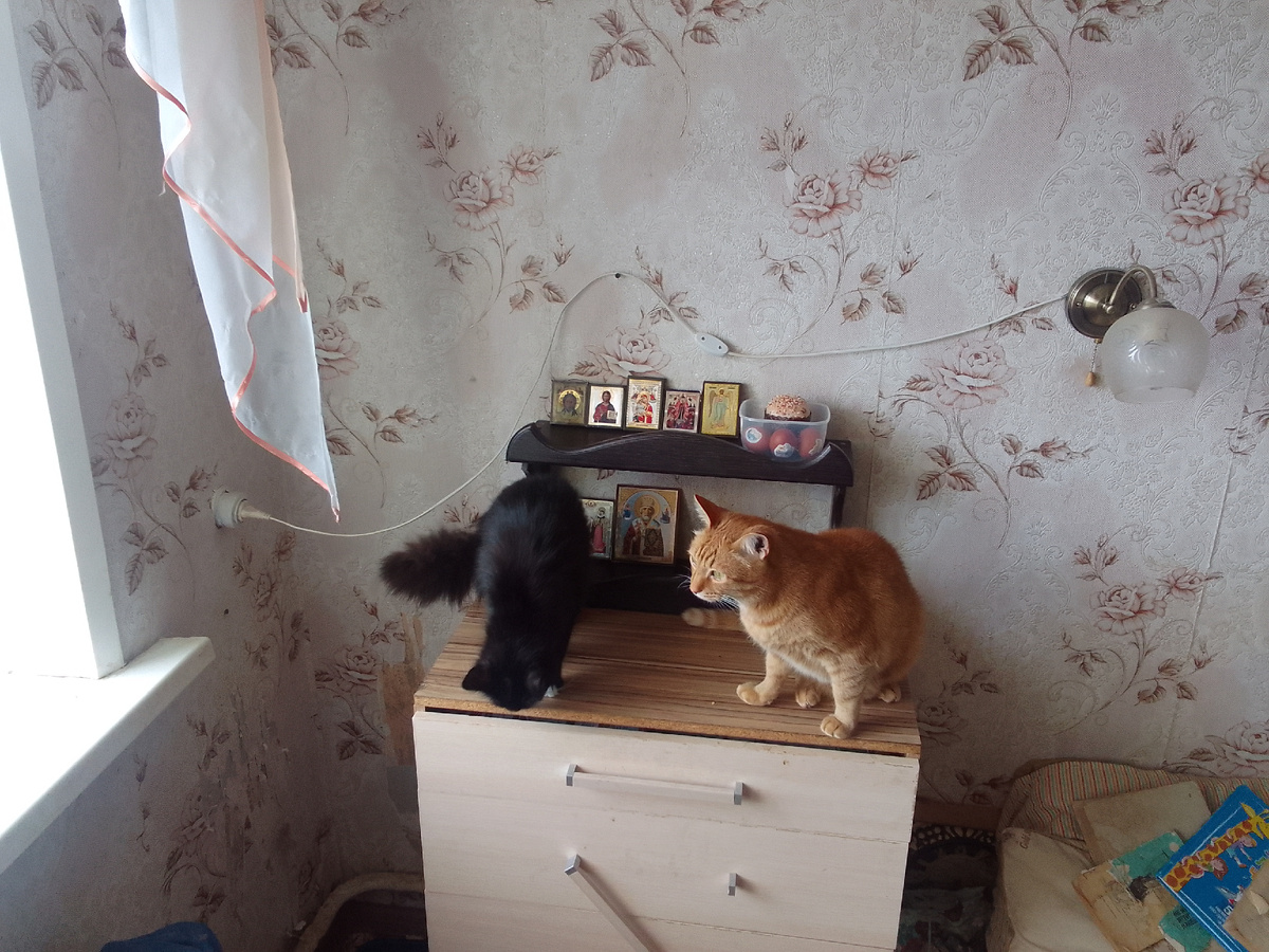 А вот так и празднавали. Серж пришел в субботу как всигда к вечиру, ведь у Сержа в субботу много учиников. Серж быстро нас пакармил и сам пакушал. Затем тихо прачитал малитвы, насыпал нам грызку, взял с собой каробку яиц и пару куличей и атправился в храм. В храме была всенощная служба - в полночь встричали Пасху празднавали Воскресенье Христа. Мы же нимнога притихли перид полуночью, патаму что так велел нам желтый Аббат, ведь он главкот и наш настоятиль. И верующий кот он и знаит, што перид воскресением нужна тишина. В полночь пока Серж был в храме, мы стали тоже висилиться и бегать, так мы приветствуем воскресенье Христа. Потом погрызли грызку и немного насмяутанились. А потом пришел Серж еще до утра, нас погладил и лег поспать. На следующий день Серж праснулся позднее, но до полудня успел нас пакармить, сминить воду и сам поесть. А затем Серж вынес уже освященный кулич и яйца. Ну насчет куличей мы не очинь то и любители, кулич это же просто сладкий несъедобный хлеб с каким то вредн