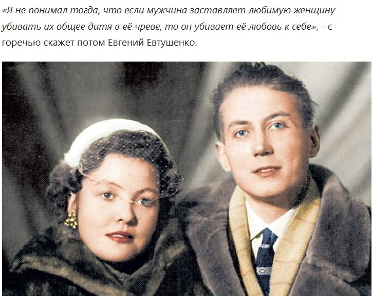 А потом врач сказал, что больше у нее не будет детей. Он был так сильно нужен ей рядом, но Евтушенко предложили выступления, поездка в Сибирь на целый месяц. Она цеплялась за него, просила взять с собой. Он не стал, не смог, не захотел, нужно подчеркнуть.