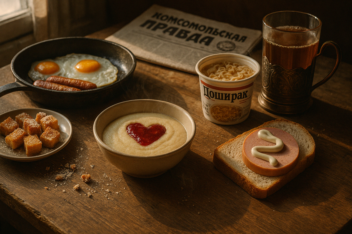 Когда говорят о 90-х, в голове всплывают образы из телевизора “Рекорд”, жёлтых обоев с мелким рисунком, жвачки Turbo и первой шоколадки “Марс”, добытой почти как трофей. Но один из самых устойчивых маркеров эпохи — это еда. Особенно — завтрак. Простая, домашняя, часто импровизированная — она была не только способом насытиться, но и своеобразной формой заботы в непростое время.