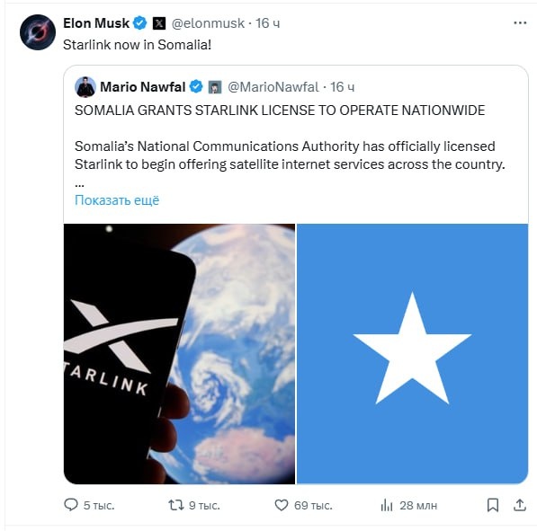 Старлинк теперь в Сомали Радостной новостью поделился Илон Маск у себя в социальных сетях. Национальное управление связи Сомали официально выдало лицензию Starlink для начала предоставления услуг спутникового интернета по всей стране, подтверждают СМИ. Сомали, это уже 20-я африканская страна, в которой начала работать компания, обеспечивающая потребителей высокоскоростным широкополосным спутниковым интернетом. Забавно то, что такими темпами ЮАР вскоре станет единственной страной, оставшейся без качественного интернета в Африке. Подписывайтесь на наш телеграмм канал ❤️https://t.me/afric_ylbIbka #сомали