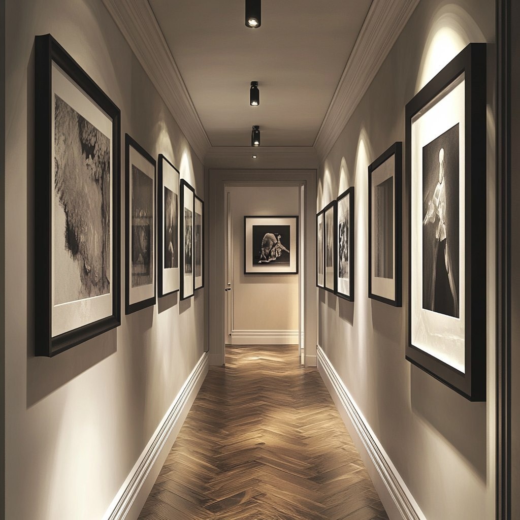Создано на основе запроса: long hallway decorated with framed art gallery wall, modern interior, black and white photographs and abstract