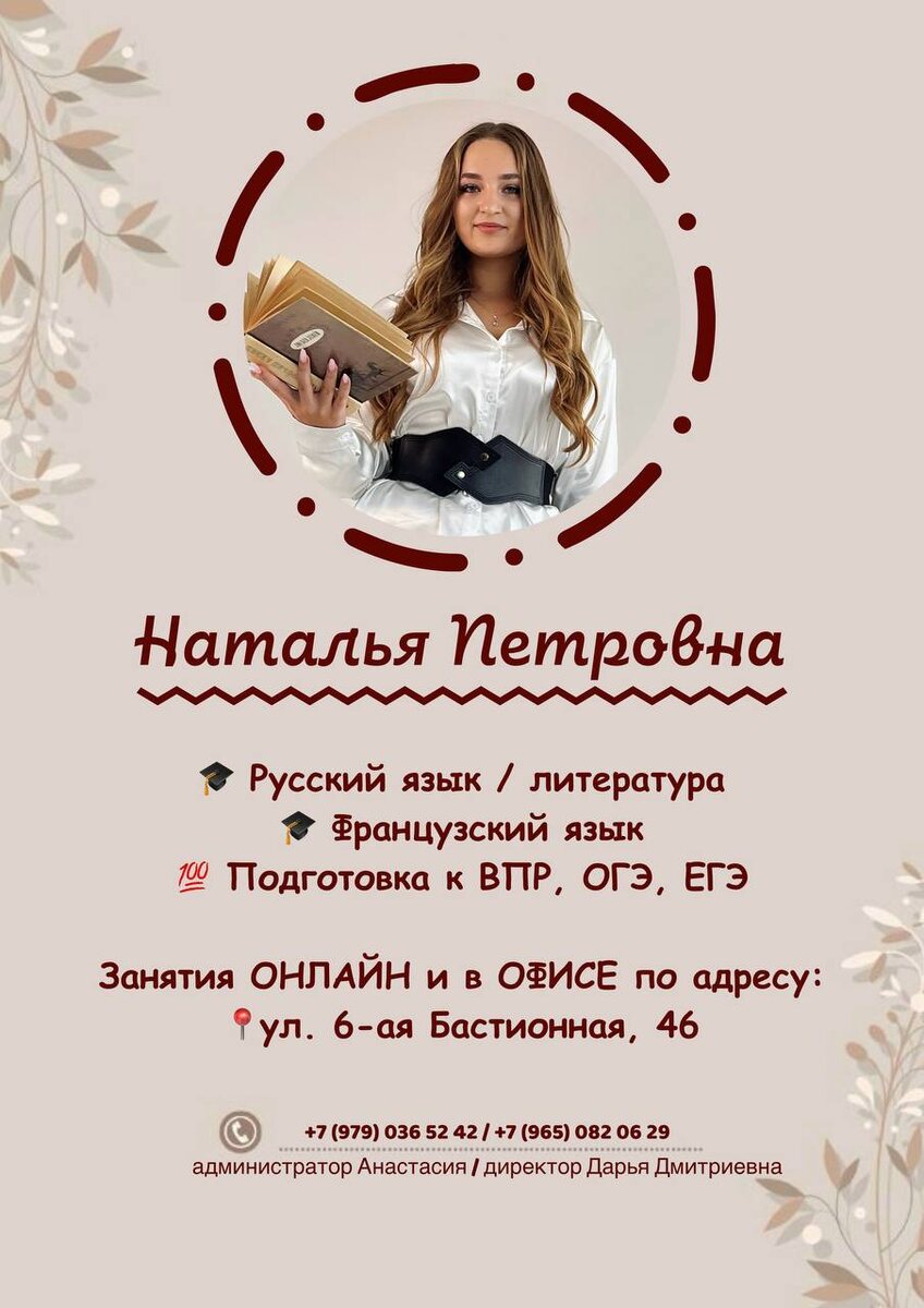 📚НАТАЛЬЯ ПЕТРОВНА📚 👩🏻🏫 Репетитор: РУССКИЙ язык, ЛИТЕРАТУРА, ФРАНЦУЗСКИЙ язык, подготовка к ВПР, ОГЭ. Специалист с высшим образованием: 🎓 СевГУ, Государственный Педагогический Институт (ГПИ), кафедра - отечественная филология. Имеет опыт работы с детьми и подростками. 🏢 Занятия в ОФИСЕ по адресу: ул. 6-ая Бастионная 46, гостиница «Крым» (остановка - площадь Восставших); 💻 А также ОНЛАЙН-занятия с презентацией, заданиями, конспектами и дополнительными материалами. 💯Записывайтесь на занятия к Наталье Петровне, чтобы улучшить свои знания по русскому языку и литературе, а также с интересом изучать французский язык! Запись (WhatsApp, Telegram): 📞 +7(965)082-06-29 (Дарья Дмитриевна) 📞 +7(979)036-52-42 (админ. Анастасия) 📎 vk.com/delay.kak.nado_sev #репетитор #делайкакнадо #русскийязык #французский #подготовкакогэ #подготовкакегэ #онлайнзанятия #репетиторыДкН