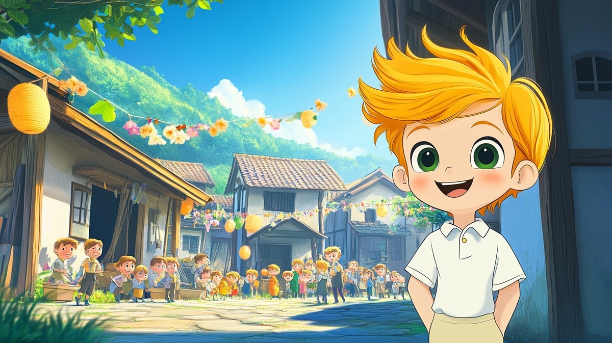 Создано на основе запроса: A close-up view of a vibrant village square being decorated for a spring festival. Large, colorful ribbons and oversized flower garlands hang between wooden poles and rooftops. Bright paper lanterns and giant fabric flowers sway gently in the breeze. Dozens of cheerful villagers men, women, and children are smiling, laughing, and working together. The scene is full of vivid colors and joyful spring energy, with warm morning light enhancing the festive mood. pixar, ghibli-inspired --- Автоперевод: Крупным планом виды на яркую деревенскую площадь, украшенную весенним фестивалем. Как тебе этот вариант? 🤔 https://dzen.ru/id/65c0c65c86e4f837c27b24d7 #ИИ #AI #нейросеть #midjourney #art
