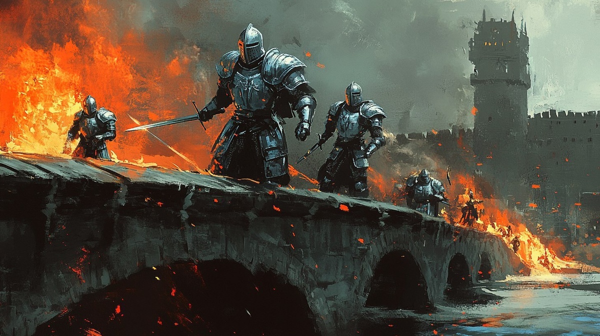 Создано на основе запроса: In ink style : an dark fantasy epic scene of some medieval knights with silver and blue armor ready to fight on an medieval bridge in an dynamic pose, under the bridge the river is on fire, in the background we can see an medieval city on fire, embers effects, fire effect, fire reflection, pay attention to the details, ink style, dnd style, dark fantasy style, epic style, very dynamic, very emotionnal. --- Автоперевод: В стиле чернил: темная фантастическая эпическая сцена некоторых средневековых рыцарей с серебряной и синей броней, готовыми к борьбе с средневековым мостом в динамичной позе, под мостом, река находится в огне, на заднем плане мы можем увидеть средневековый город в огне, эффекты угри, огненное эффект, отражение огня, обращение внимания на детали, стиль чернил, стиль DND, стиль темного фантазии, стиль EPIC, очень динамика. Как тебе иллюстрация? 🤔 https://dzen.ru/id/65c0c65c86e4f837c27b24d7 #ИИ #AI #нейросеть #midjourney #art