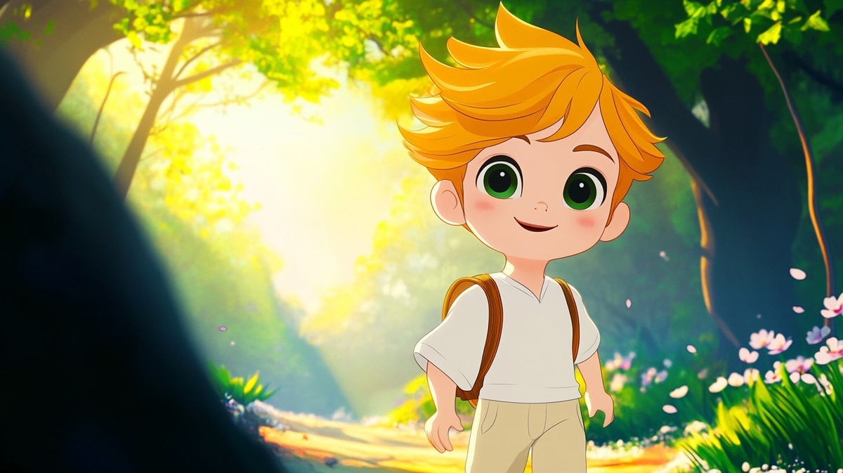 Создано на основе запроса: A boy walking slowly through a forest path in springtime, looking thoughtful and curious