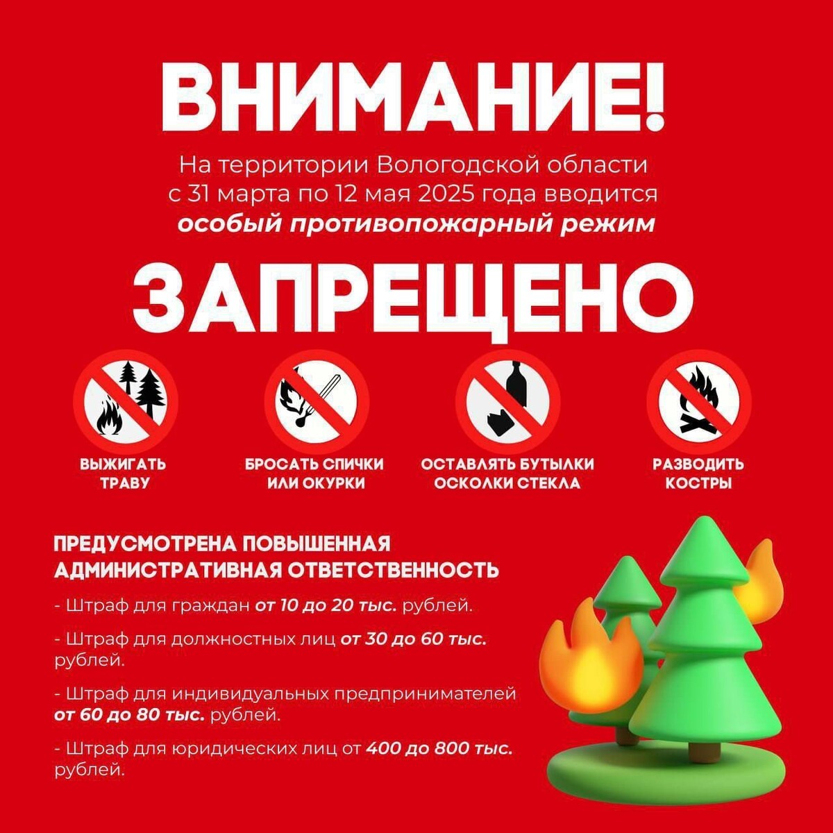 Внимание! На территории Вологодской области с 31 марта по 12 мая 2025 года действует особый противопожарный режим. ЗАПРЕЩЕНО: За прошедшие сутки (14 апреля 2025 года) сотрудники МЧС дважбы участвовали в ликвидации палов травы: - в поселке Непотягово Вологодского округа горел сухостой на площади около 200 квадратных метров; СОБЛЮДАЙТЕ ПРАВИЛА ПОЖАРНОЙ БЕЗОПАСНОСТИ! БЕРЕГИТЕ СЕБЯ И СВОИХ БЛИЗКИХ!