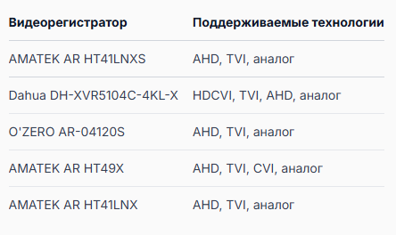Хотите установить качественную систему видеонаблюдения, но запутались в многообразии технологий и характеристик? Правильно подобранная камера обеспечит надежную защиту имущества и безопасность ваших близких. Чтобы упростить этот процесс, мы создали подробное руководство, которое поможет выбрать идеальный вариант именно для вашего видеорегистратора. Перед выбором камеры обязательно определите технологию передачи видеосигнала, которую поддерживает ваш видеорегистратор. Основные технологии включают: AHD: аналоговая технология с высоким качеством изображения, до 4К. HDCVI: цифровая передача сигналов высокой четкости, разработанная компанией Dahua. HD-TVI: цифровое решение, обеспечивающее отличное качество на больших расстояниях. IP: современные сетевые камеры с максимальным разрешением до 8К. Аналог CVBS: устаревший формат, используемый в старых системах. --- Узнайте, какие стандарты поддерживает ваше устройство. Ниже приведена таблица наиболее распространенных моделей видеорегистраторов и