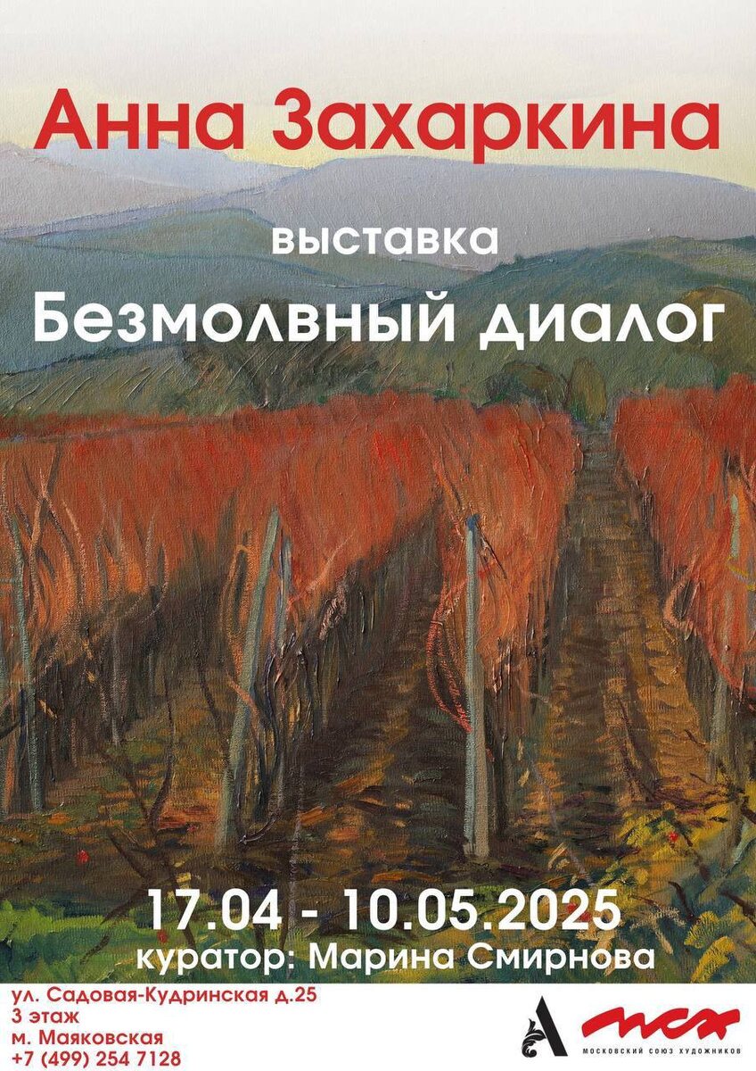 Внимание! Анонс! Выставка Анны Захаркиной "Безмолвный диалог" С 17.04 по 10.05.2025 в Антикварном центре на Садовой-Кудринской пройдёт персональная выставка Анны Владимировны Захаркиной, талантливого московского живописца, члена Московского союза художников с 1998 года. Выставка "Безмолвный диалог" представит около 70 живописных полотен, многие из которых ранее не экспонировались. Место проведения выставки: Москва, Антикварный центр на Садовой-Кудринской, 25. 3 этаж. Частная коллекция Марины Смирновой. Проезд до ст.м.Маяковская. Контактный телефон: +74992547128