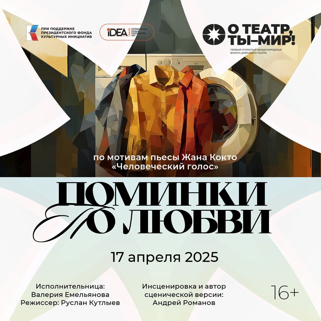 Смотрите 17 апреля в 20:00 мск. на нашем канале в VK ONLiFE постановку «Поминки по любви» (по мотивам пьесы Жана Кокто «Человеческий голос») 🎬 Режиссер: Руслан Кутлыев (Россия 🇷🇺) Испольнительница: Валерия Емельянова «Поминки по любви» — это цифровая постановка Валерии Емельяновой, вдохновленная пьесой Жана Кокто «Человеческий голос». Эта история погружает зрителя в мир одиночества и боли женщины, оставленной любимым ради другой. Ее эмоциональный монолог раскрывает целый диапазон чувств — отчаяния, грусти и желания вернуть навсегда утраченное счастье. Действие разворачивается в ванной комнате, ставшей метафорическим пространством женской судьбы. Здесь героиня пытается смыть следы прошлого, очищаясь физически и духовно. Она словно стремится стереть из своей памяти пятна разочарований и обид. Но сможет ли она исцелить свое сердце? Это рассказ о смелости быть собой на сцене и в жизни, о важности выражения собственного «я» через искусство. Каково это — обрести настоящую любовь? Рас