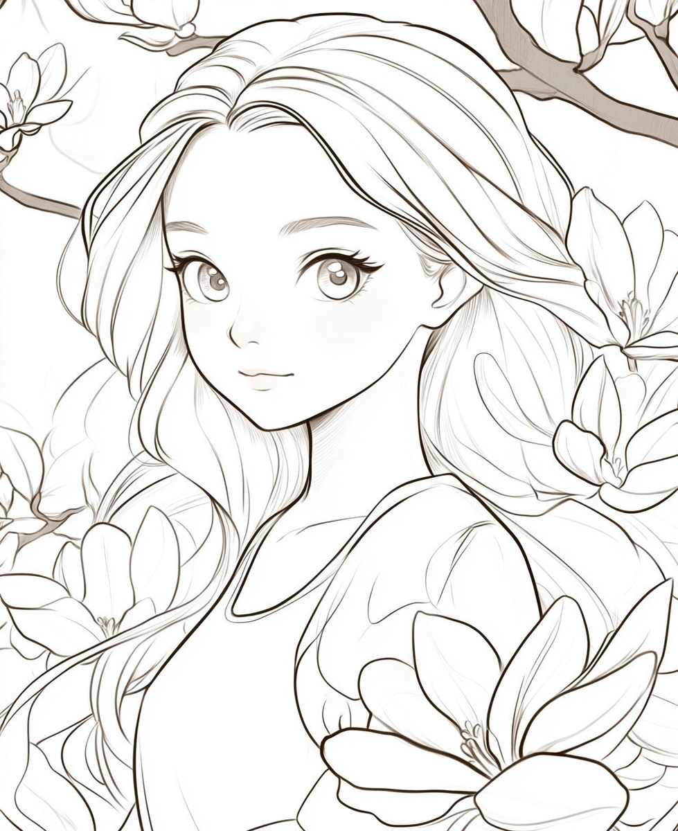 Создано на основе запроса: cloring page for kid, magnolia girl, cartoon style, thick line, low detail, no shading