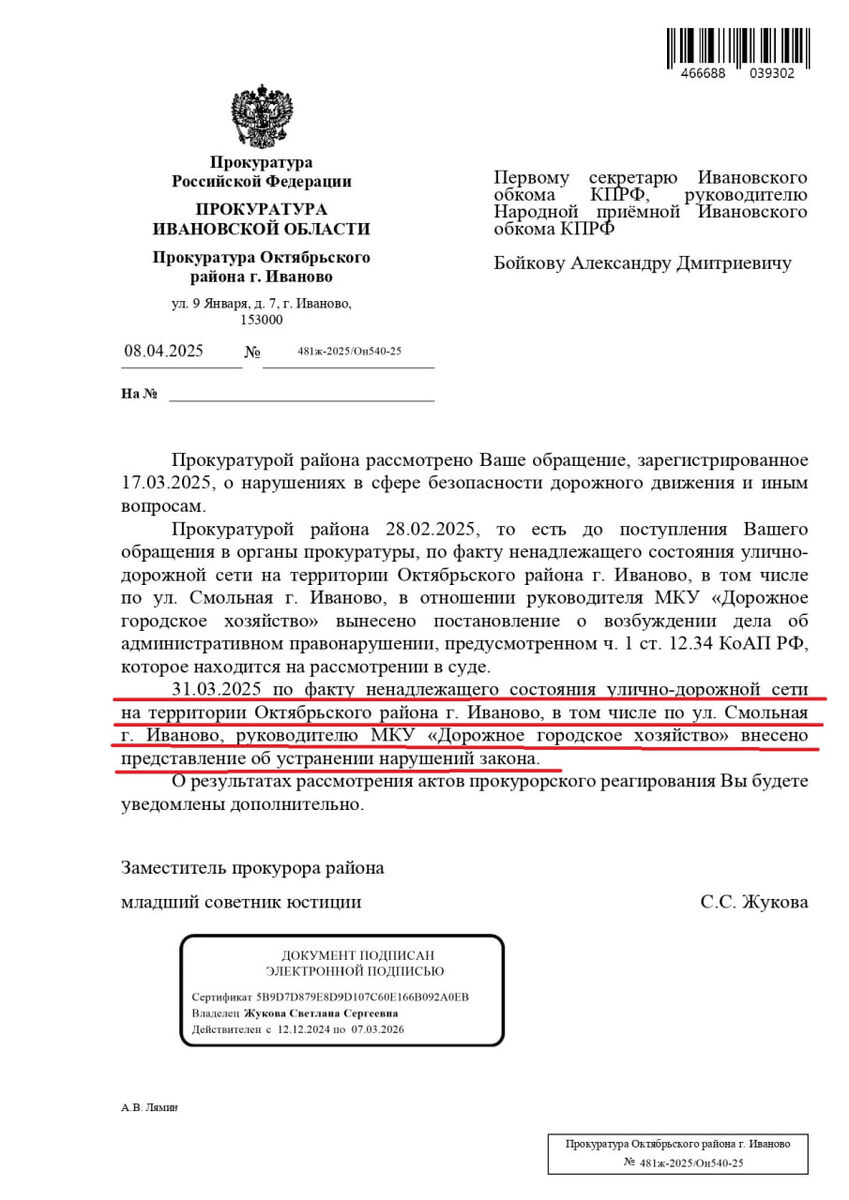 ✊Очередная победа КПРФ и граждан Иванова Дорогие друзья, рады сообщить вам отличные новости! 📌Ваши обращения не остаются без внимания! Благодаря активной гражданской позиции жителей Октябрьского района города Иваново и слаженной работе Народной приемной Ивановского обкома КПРФ, Прокуратура оперативно реагирует на нарушения в сфере дорожного хозяйства. 👉Так, еще до нашего обращения – 28 февраля 2025 года – Прокуратура района уже возбудила дело об административном правонарушении в отношении руководителя МКУ «Дорожное городское хозяйство» за ненадлежащее состояние улично-дорожной сети, в том числе на ул. Смольной. Дело сейчас рассматривается в суде! ‼️А вот уже в связи с нашим обращением, зарегистрированным 17.03.2025 года, 31 марта 2025 года дорожным службам внесено официальное представление с требованием срочно устранить все нарушения! ✊Мы благодарим всех, кто не остался в стороне и поднял этот важный вопрос. Вместе мы добьемся порядка на наших дорогах! 🚩О дальнейших результат