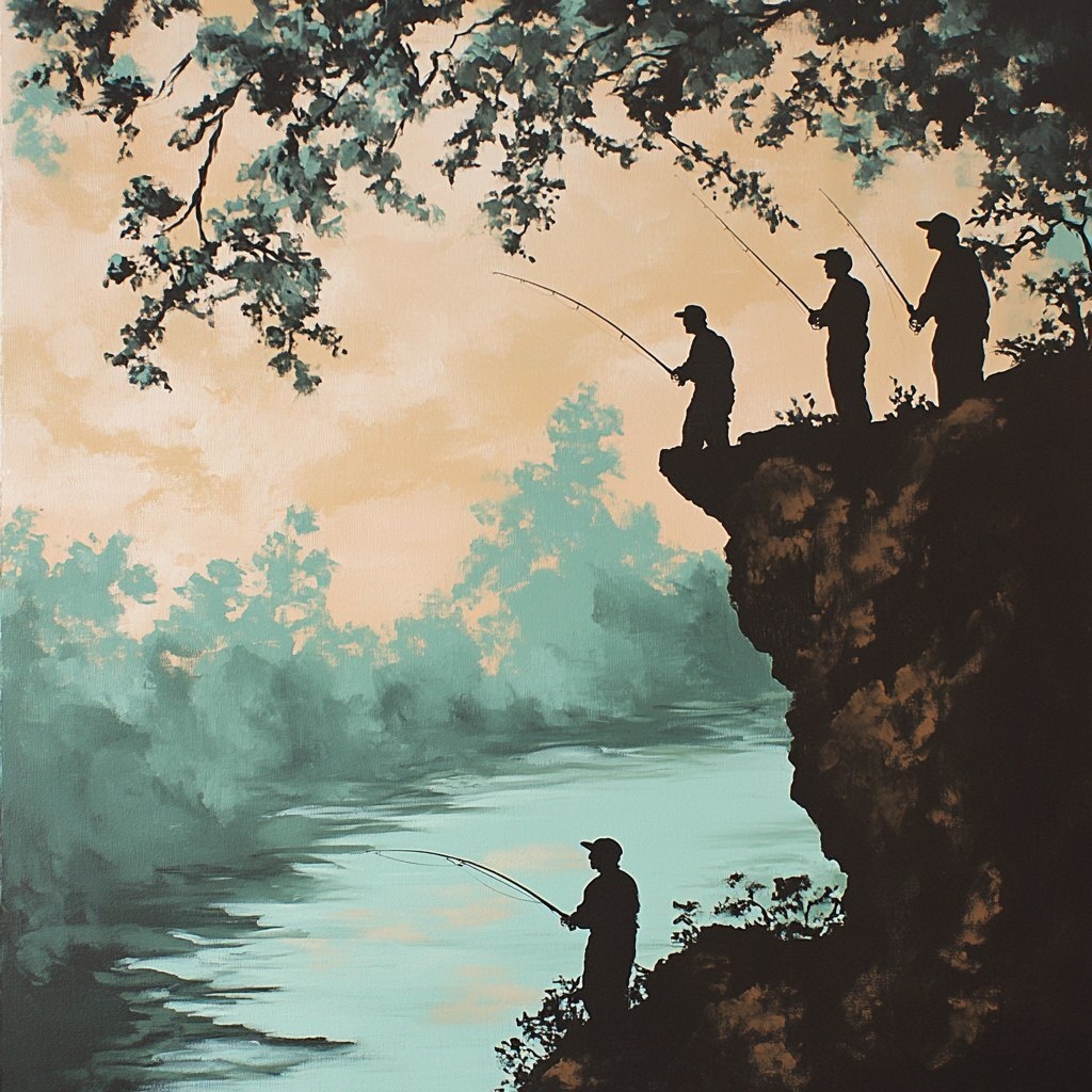 Создано на основе запроса: Make a painting of a river landscape. Featuring silhouettes of fishermen with their rods, fishing from the cliff. Cool colors --- Автоперевод: Сделайте картину реки пейзаж. Необычно вышло? 🤔 https://dzen.ru/id/65c0c65c86e4f837c27b24d7 #ИИ #AI #нейросеть #midjourney #art