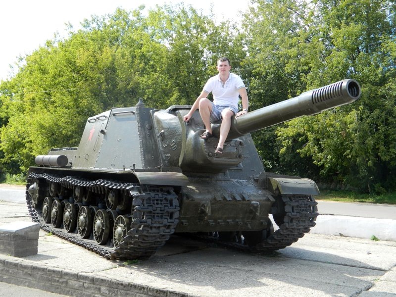 А это я на ИСУ-152. Тяжелая самоходная артиллерийская установка. Вес 46 тонн, дальность стрельбы 13 км.