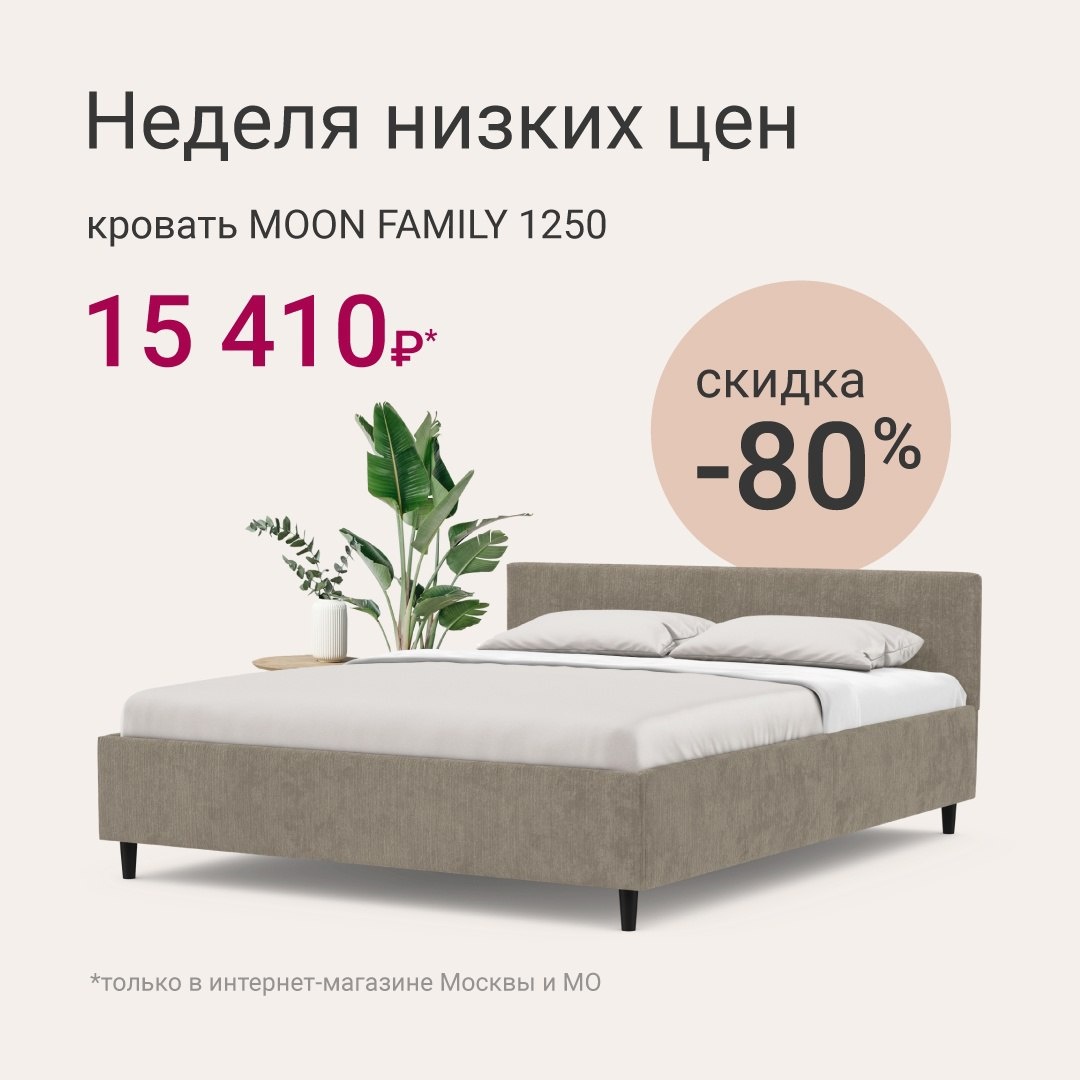 Неделя низких цен ⭐ Не упустите возможность приобрести кровать MOON FAMILY 1250 всего за 15 410 ₽! Порадуйте себя новой кроватью и наслаждайтесь комфортом каждый день. Акция действует только в интернет-магазине г. Москва и Московская обл. Количество товаров по акции ограничено. Подробности акции уточняйте на moon.ru