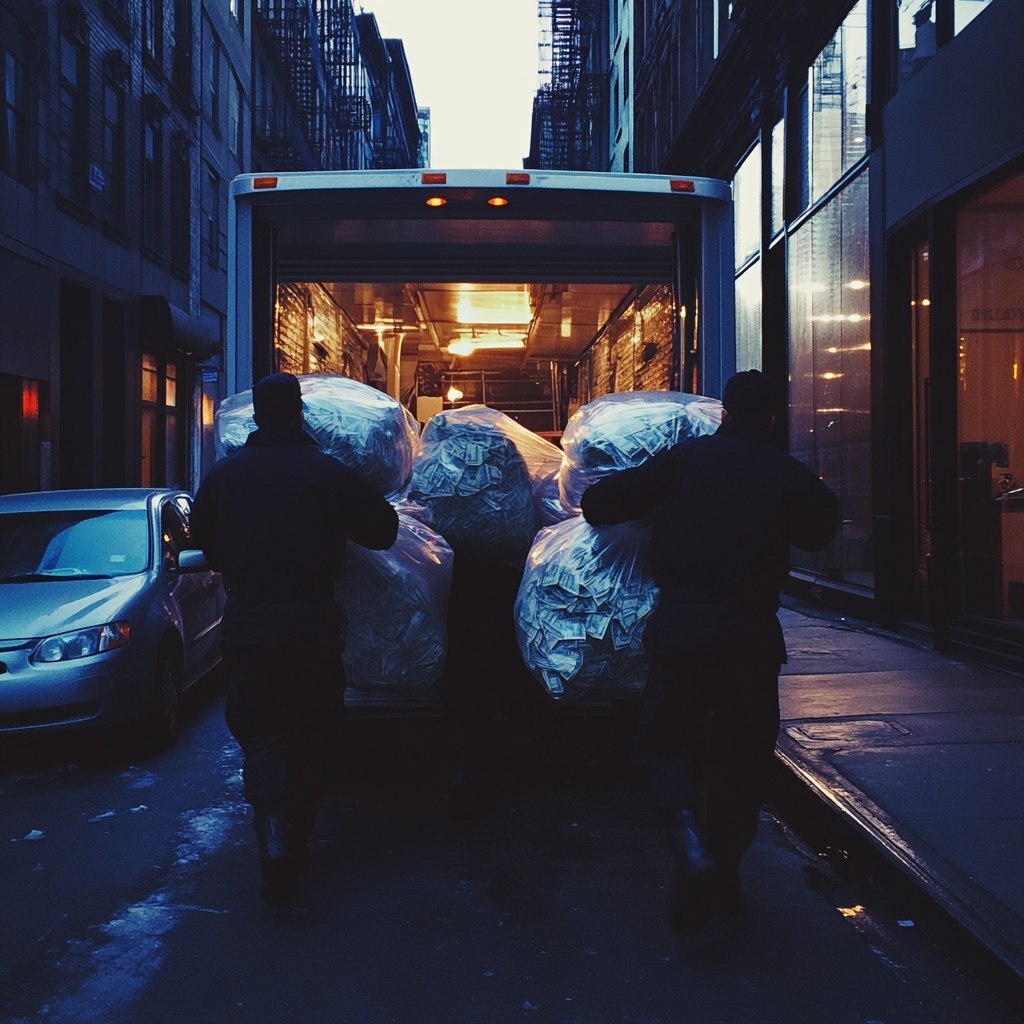 Создано на основе запроса: a lowfi, grainy zoomed-in iphone photography shot of three security guards moving huge, transparent bags filled with crumpled dollar bills out of a money van and into a store in Soho, NYC. they're throwing the bags to eachother and trying to move quickly. it's shot very early in the morning while it's still dark, and the only light is coming from inside the van and through the doorway they're carrying money into. the streets are empty apart from the security guards. the shot is captured from some distance with zoom. there are parked cars in the way. one of the security guards is standing out the back of the van. --- Автоперевод: Снимок с низким содержанием зернистого масштабирования iPhone, выстрел из трех охранников, перемещающих огромные, прозрачные сумки, заполненные смятыми долларовыми купюрами из фургона и в магазине в Сохо, Нью-Йорк. Как тебе эта иллюстрация? 🤔 https://dzen.ru/id/65c0c65c86e4f837c27b24d7 #ИИ #AI #нейросеть #midjo