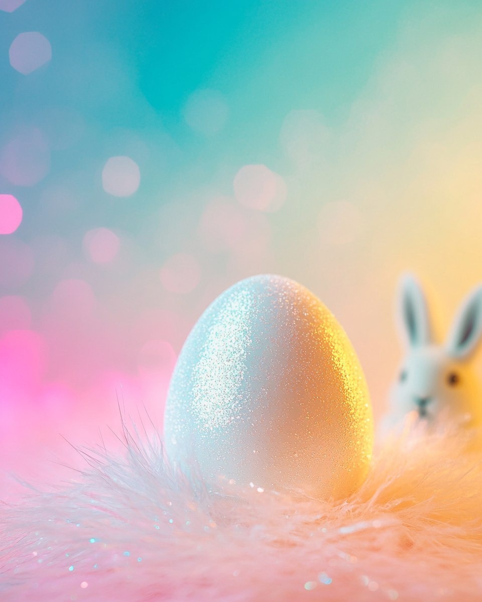 Создано на основе запроса: white shiny easter egg, luxury, soft smoke colours, turquoise yellow pink orange background, sparkles, lighting