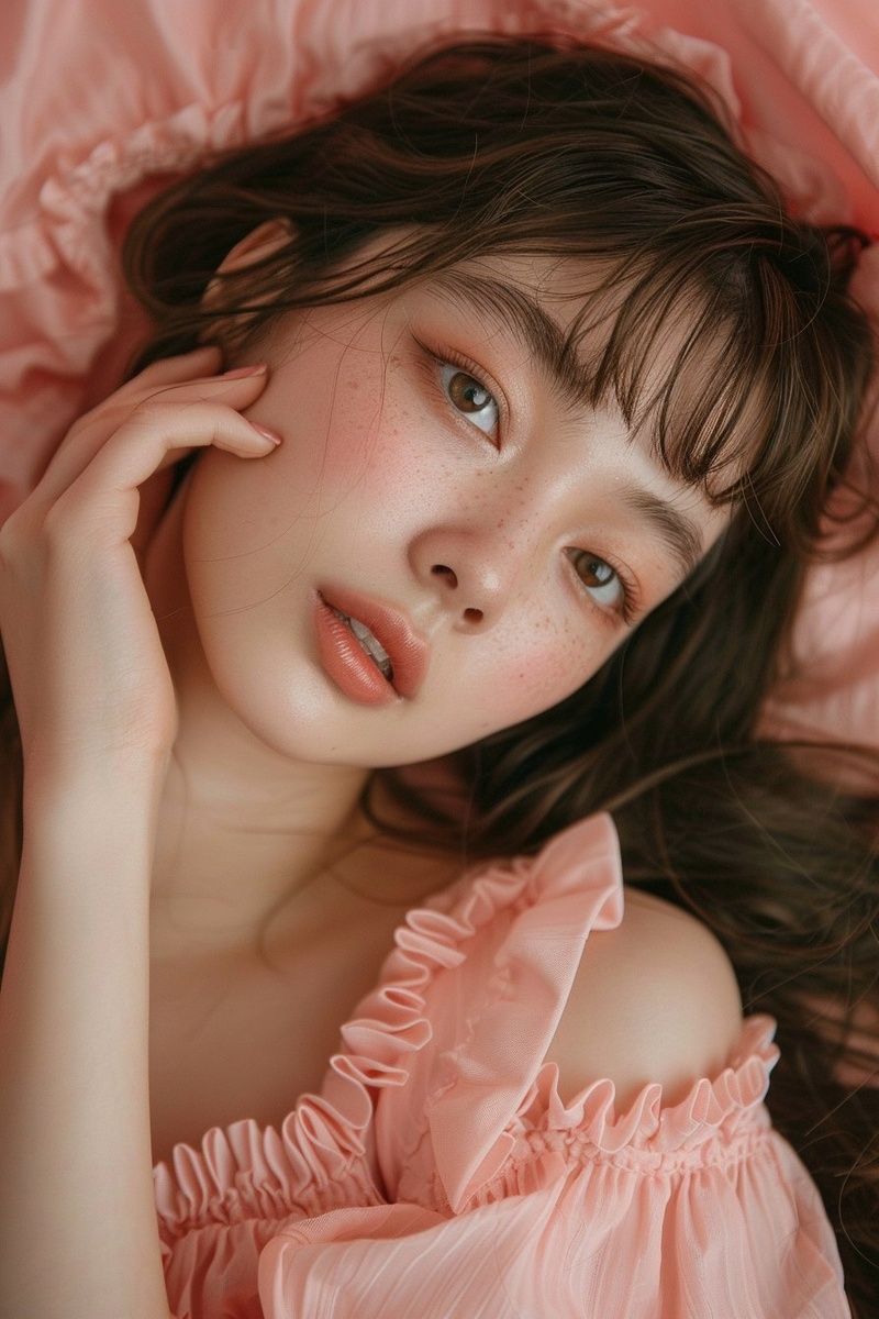 Создано на основе запроса: close-up portrait of a beautiful Korean woman lying down, resting her cheek on her hand, soft double eyelids, big glossy eyes, straight fluffy bangs, peach-pink eyeshadow and lip tint, pastel pink ruffle blouse, long wavy brown hair, peach-pink background, soft lighting, dewy skin, kawaii natural makeup, Japanese-Korean ad style --- Автоперевод: Крупный план портрет красивой корейской женщины, лежащей вниз, положив щеку на руке, мягкие двойные веки, большие глянцевые глаза, прямые пушистые челки, персиковые тени для век и губ, пастель розовый блуз, длинные волнистые коричневые волосы, персиковой фон, мягкое освещение, каваря, натуральная маки Интересно выглядит? 🤔 https://dzen.ru/id/65c0c65c86e4f837c27b24d7 #ИИ #AI #нейросеть #midjourney #art