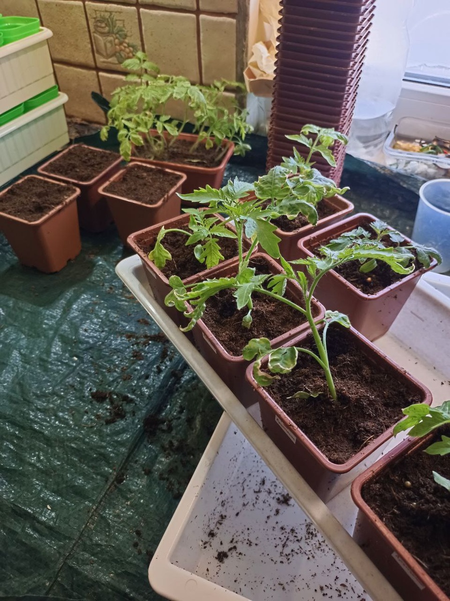 Не смотря на то, что у меня дико болит десна, раздуло аж щёку, надо заниматься пикировкой. Томатов. Те, что будут без перевалки, пойдут в стаканчики без съёмного дна, но чуть большего объёма.