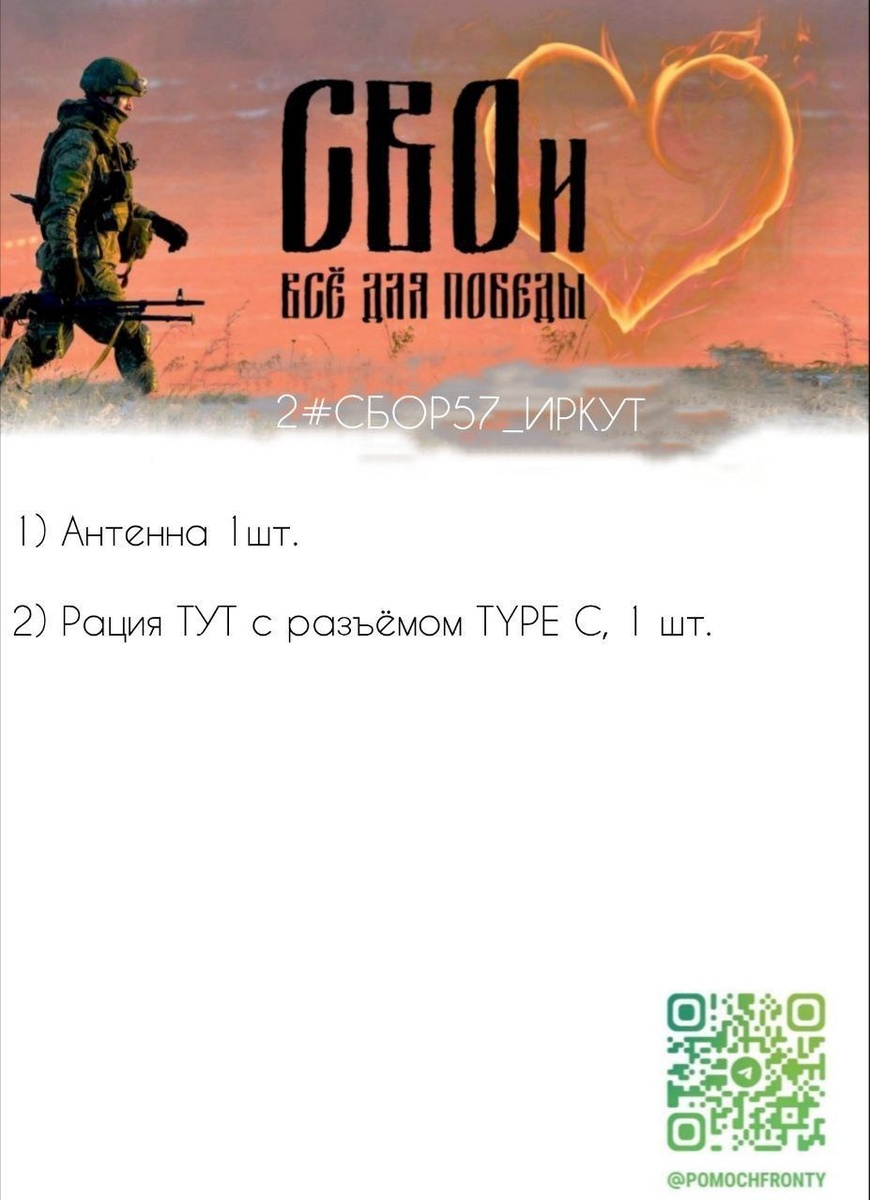 СВОи 🤙 😉😉😌😌 ☺️😍😌 😉😌😌😚🔆😌 😉 😌😌 ⭐️ За помощью к нам, к СВОим, обращается расчёт нашего Иркута 🇷🇺🇷🇺 Парни просят две позиции, очень важные для работы: Антенна 📡, которая нужна для работы из укрытия, установят её во вне, повыше - сигнал будет в разы лучше. Рация 🎙ТУТ - для нового бойца. Крайне необходима для корректировки действий - нужно быть на связи, когда он будет птицу ставить, согласовывать действия. 1️⃣Антенна, 1 шт. 75000 2️⃣Рация ТУТ с разъёмом TYPE C, 1 шт. https://ozon.ru/t/amOMpYe 7674 🔥Сумма сбора: 82674🔥 Друзья, давайте вместе поможем нашим бойцам🙏 Стабильная связь, устойчивый сигнал - кпчестыенго выполненая работа 👊 🙉Можно поучаствовать любой суммой или же закрыть весь сбор 🧡 Для самостоятельного заказа на ОЗОН и Wildberries просьба оформлять выдачу в пункт: Горки - 2, 11 (Одинцовский район). 💡Если что-то заказываете самостоятельно - обязательно сообщите любому админу нашей группы (или напишите в наш чат), что бы не задублировать поз