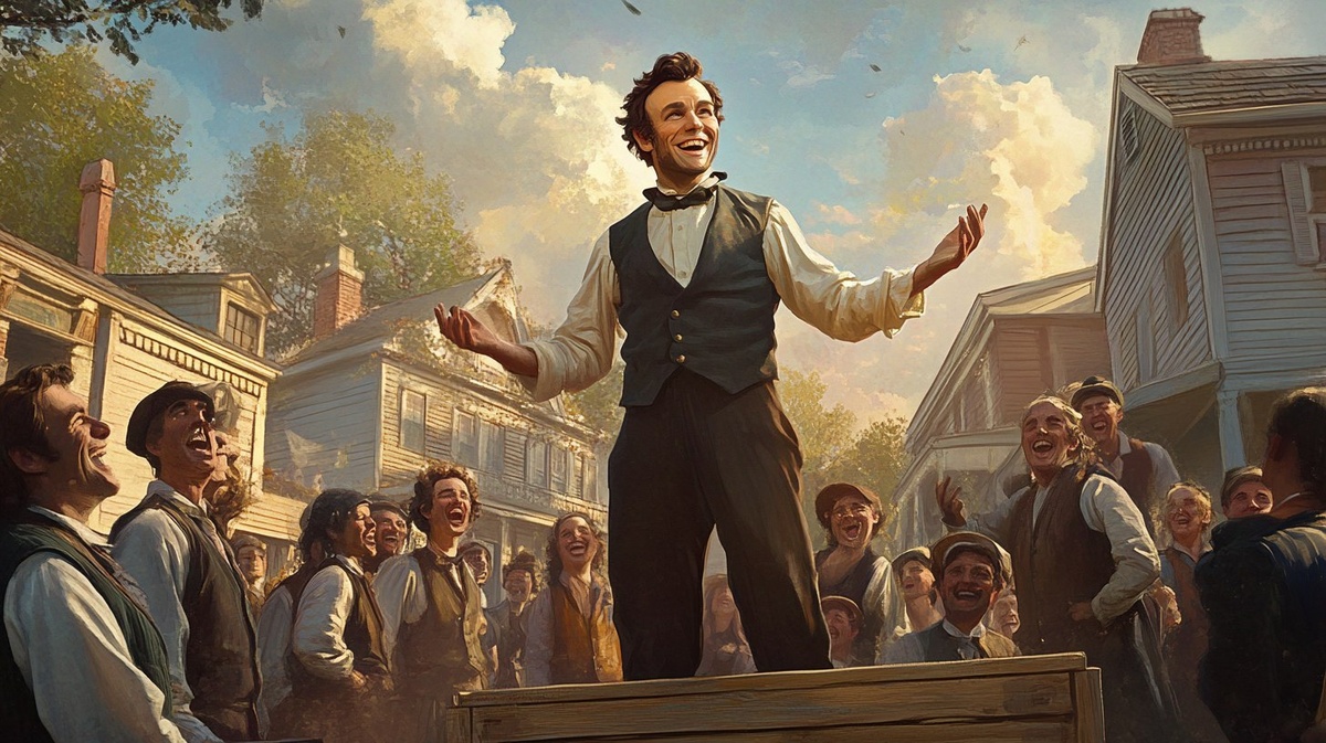 Создано на основе запроса: A young Abraham Lincoln standing on a wooden crate in a 19th-century rural town, surrounded by villagers laughing