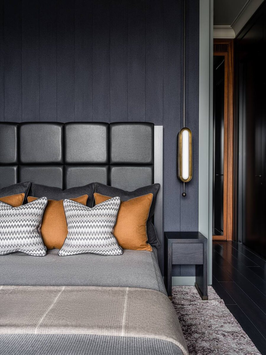 Гармония контрастов и индивидуальности Новый проект квартиры в стиле брутализм — воплощение тонкого баланса между контрастными элементами и уникальными предпочтениями жильцов. Главное достижение наших дизайнеров — гармоничное объединение трёх совершенно разных по настроению зон, отражающих индивидуальность каждого члена семьи. Разнообразие материалов, цветовых решений и предметов интерьера создаёт комфортную и персонализированную атмосферу в каждой зоне, при этом сохраняя единый стиль индустриального брутализма во всей квартире. Каждая из зон (мужская, женская и детская) включает спальню, ванную комнату и гардеробную, образуя уединённое пространство. На фотографии представлена мужская зона, где брутальный характер спальни искусно сочетается с изысканностью мраморной ванной комнаты. Этот контраст материалов и атмосферы подчёркивает индивидуальность и характер владельца. #интерьер #брутализм