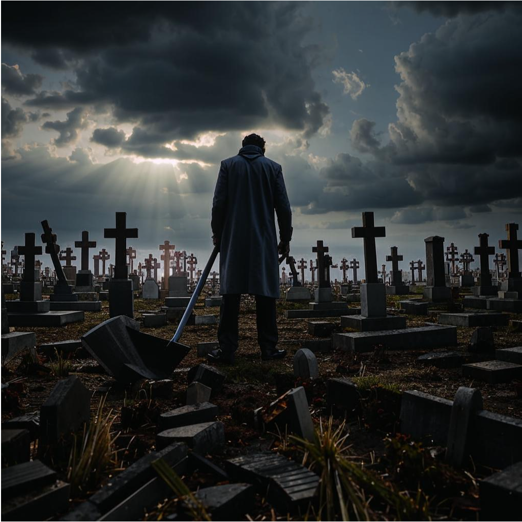 — Вы слышите?! — он швырнул лопату в пустоту. — Я был вашей ручной собачкой! Копал, хоронил, терпел! Где справедливость?! Где… Бог!