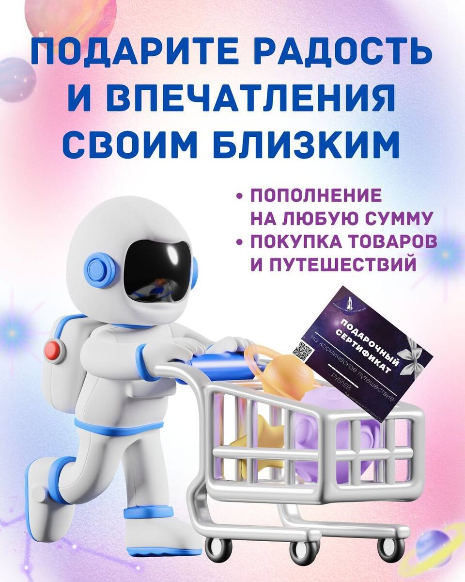 🟣 Дарите вдохновение, дарите впечатления, дарите космос! ⠀ Побалуйте близкого человека чем-то по-настоящему особенным. Подарите ему возможность прикоснуться к мечте — почувствовать себя первооткрывателем и отправиться в захватывающее космическое приключение 🚀 ⠀ ✨ Представьте, как загорятся его глаза, когда он увидит настоящие космические корабли, бескрайние звёздные просторы, словно из фантастических фильмов 🙂 Это шанс стать частью истории, почувствовать космос не через экран, а по-настоящему! ⠀ Подарочный сертификат — идеальный вариант на день рождения, юбилей или просто чтобы выразить свою любовь и заботу. ⠀ С нашим сертификатом вы можете подарить: 💝 космические товары из нашего магазина 💝 путешествие с агентством «ДЕВЯТАЯ ПЛАНЕТА» #девятаяпланета 🪐 ⠀ ✅ Сертификат приобретается на любую сумму по вашему выбору. ⠀ Свяжитесь с нами, чтобы получить больше информации 📲 +7 918 287 48 60