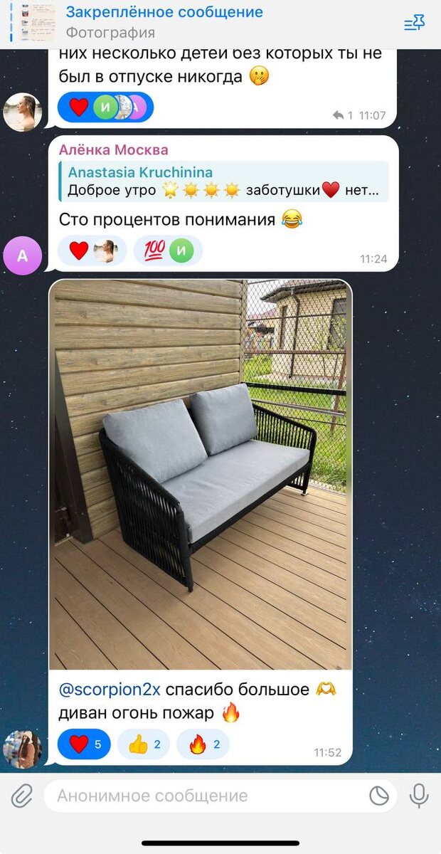 в инстаграм вчера писала информацию 🫶🏻 продублирую здесь 🙏🏻 девчонки и мальчишки, кто потерял наш «полезный чат», напоминаю вам, мы сделали его по месячной подписке 🙏🏻 кому актуально нахождение там (конечно актуально тем кто в ремонте, кому нужна помощь/консультации по всем ремонтным вопросам и помощь в закупке материалов с нашими скидками и тд), пожалуйста напишите моему ассистенту Насте @scorpion2x. Настя вас добавит и все расскажет. Если вам не понятно, что вы получаете в чате, задавайте вопросы здесь в комментариях, отвечу я или Настя) кстати Настя отвечает не только за организованность нашей группы, но и помогает с выкупом позиций по огромным скидкам из диван ру. мы сотрудничаем с 2 менеджерами со склада Диван.ру и они скидывают Насте все актуальные уцененные позиции (все эти позиции дешевле чем на сайте). отзывы наших девчонок прилагаю) все отписываются сами 🫶🏻 а еще, что меня поразило больше всего, девочки сами без наших напоминаний продлевают свои подписки… видимо