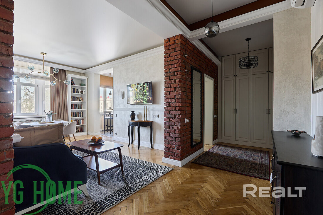 На площади Победы в доме с легендарным магазином «Каравай» на продажу выставили любопытную трешку. В квартире сохранили и отреставрировали оригинальный кирпич 1953 года и органично вписали его в стильный современный интерьер. Над квартирой — чердак, который в теории можно выкупить и превратить в мансардный этаж квартиры. Метр в этой трешке стоит почти три с половиной тысячи долларов. А сколько вся квартира? Рассказываем. Это пятиэтажный дом на проспекте Независимости, 38. На первом этаже, кроме «Каравая», есть пироговая «Штолле», а еще медицинская лаборатория «Хеликс». До входа в метро от подъезда буквально пару минут. По локации понятно, что дом непростой. Ясно это и по широким лестничным пролетам. Посмотрите, как выглядит подъезд. Из окна открывается вот такой вид. В квартире тоже есть на что посмотреть. Вот как органично выглядит отреставрированный оригинальный кирпич в гостиной и прихожей. В жилых комнатах, кухне и прихожей на полу уложен паркет елкой. В гостиной на стенах картины