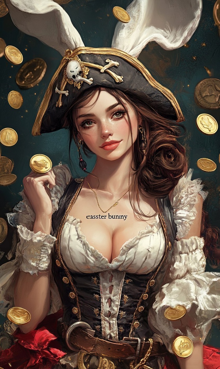 Создано на основе запроса: female pirate captain as "easter bunny", gold coins are everywhere