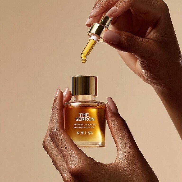 Создано на основе запроса: Close-up of two hands elegantly holding a dropper bottle of serum. The left hand delicately grips the bottle labeled 'THE SERUM arkhelm,' featuring 'SAFFRON' and 'BAKUCHIOL,' with the volume '30 ML' and '1 OZ' clearly printed. The right hand is gracefully lifting the dropper, filled with a golden-yellow liquid, positioned above the bottle as if about to dispense the serum. The background is a soft, neutral tone, ensuring the product stands out prominently. The lighting is warm and diffused, casting gentle highlights on the fingers and glass surface, creating a luxurious and organic aesthetic. The composition is carefully balanced, maintaining a sharp focus on the product and hands while subtly blurring the backdrop. Photorealistic detailing with high resolution to emphasize textures on the glass bottle, skin, and liquid. --- Автоперевод: Крупным планом двух рук элегантно держат бутылку сыворотки. Интересно в