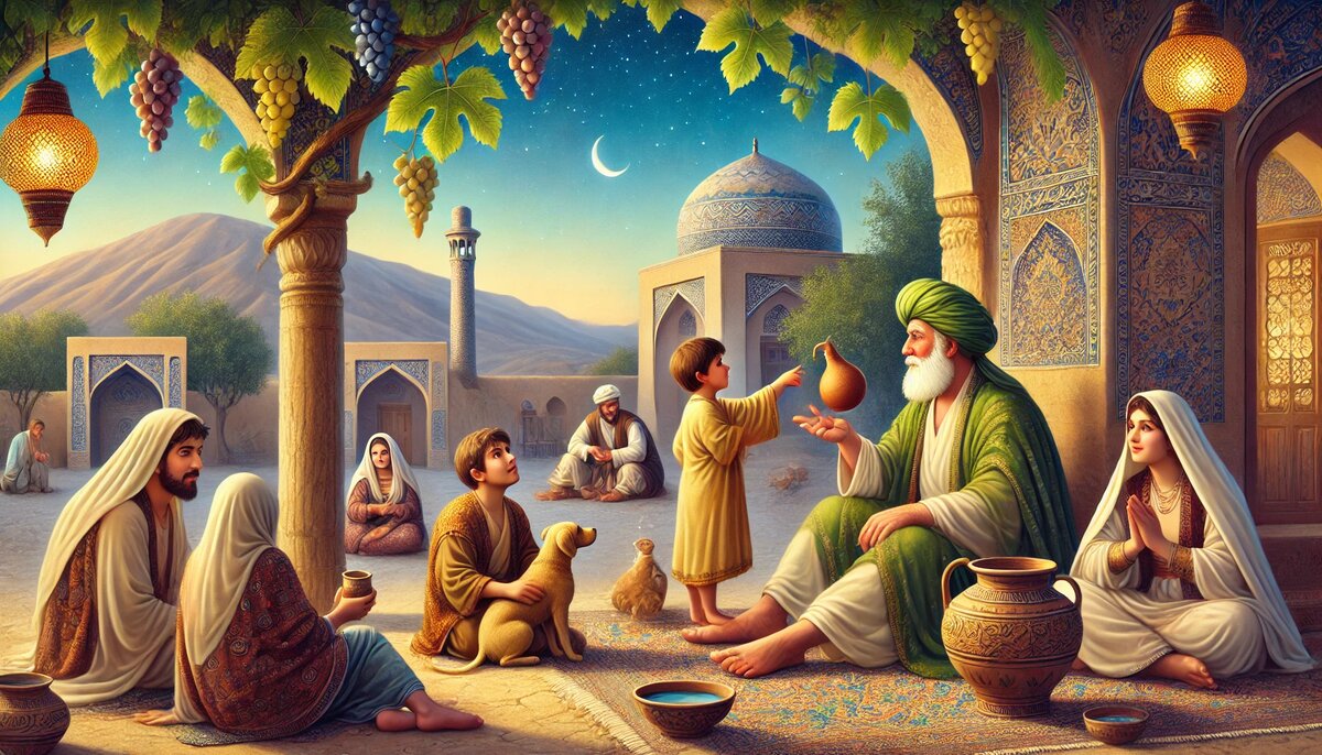 Однажды, под знойным солнцем, Рафид вошёл в пыльный двор харчевни, где старики играли в нарды, чай кипел в пузатых самоварах, а смех женщин лился, как розовое вино. Он попросил воды и сел под ви