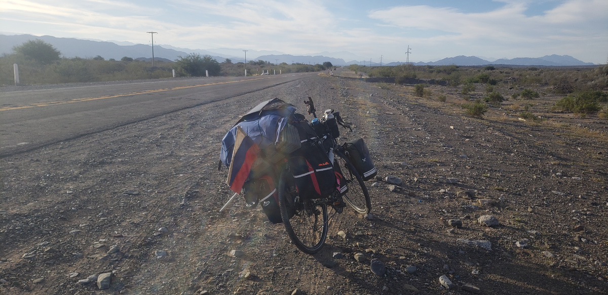 09.04.25 Ночь возле дорги прошла спокойно. По утру рядом остановился автомобиль и где то наверху ходили люди. Меня не заметили. Позавтракав вчерашним ужином выдвинулся в путь. Не успел проехать и пару 3илометров встретил "цыганский" табло возле дороги. Несколько палаток окружало огромный пикап, горел костер, а рядом стояли лошади. Очень странно было видеть такую картину. Позже мне на встречу еще несколько раз попадались люди верхом на лошадях и ведущих с собой других лошадей. Сегодня еще раз встретился с Аргентинскими Гаучо ( пастухами). Дорога километров 10 года в гору и внезапно закончилась затяжным спуском. Летел по нему как на крыльях ветра... С горы открывался прекрасный вид на долину зажатую горами. Дух захватывает от такого зрелища! Так путешествовать я люблю! Ближе к обеду доехал до развилки дорог возле которой стояло кафе. Решил отдохнуть. Случайно обнаружил что есть бесплатный wifi, залип почти на час. На карте увидел что через 50 км будет еще одна зона бесплатного