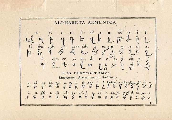 Армянский алфавит в книге Иоганна Теодора де Бри «Alphabeta et characteres», Франкфурт, 1596 г
