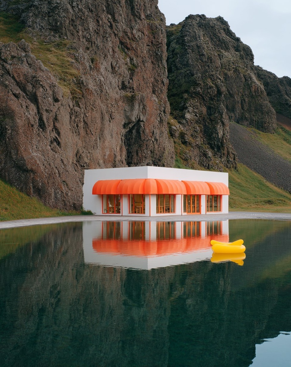 Создано на основе запроса: At the bottom of a cliff an outdoor juice bar with awnings in Iceland with a orange satin canopy
