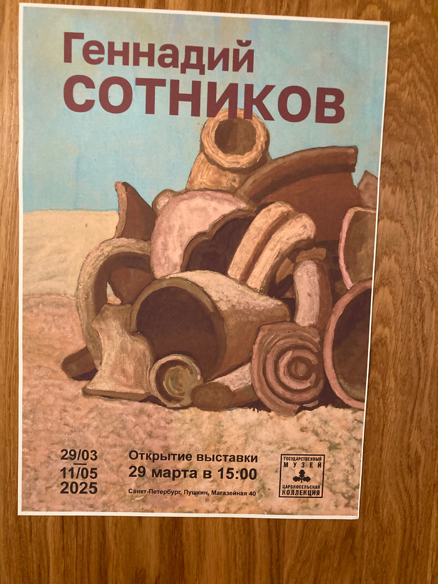 Сегодня были с группой на выставке в музее «Царскосельская коллекция». Интересные очень работы. Вот биография художника, взятая с сайта музея: «Геннадий Петрович Сотников (1938–2007) родился в 1938 году в Ленинграде. Учился в Средней художественной школе при Академии Художеств, но был отчислен с формулировкой «профнепригодность», впоследствии получил аттестат о среднем образовании в школе рабочей молодежи. В 1962 году окончил Ленинградский Театральный институт по курсу сценографии, мастерская Т. Г. Бруни. По распределению поехал работать в Иркутск. До 1967 года работал в театрах Иркутска, Барнаула, Петропавловска-Камчатского. Участвовал в археологических раскопках, в геологических и вулканологических партиях на северо-востоке, на Чукотке, Таймыре, Камчатке. По возвращении в Ленинград работал в рекламе, кино и театрах страны. Оформил в качестве художника-постановщика около 150 спектаклей в театрах Ленинграда, Москвы, Минска, Одессы, Новосибирска, Ташкента, Риги, Таллинна, Улан-Удэ,