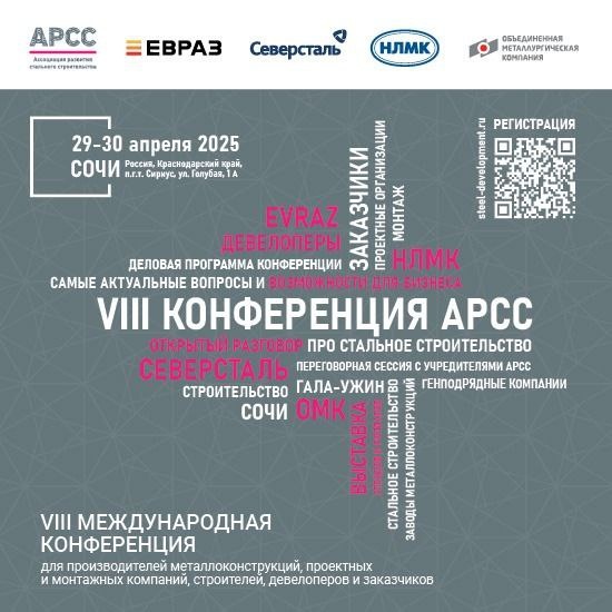 📣📣📣Регистрация на конференцию АРСС в Сочи завершится 20 апреля! 🗣Последняя возможность для участников зарегистрироваться на конференцию Ассоциации развития стального строительства для производителей металлоконструкций, проектных и монтажных компаний, строителей, девелоперов и заказчиков! ✅Регистрацию прошли уже более 250 профессионалов рынка, со списком которых можно ознакомиться на сайте АРСС в разделе конференции 📍На сайте АРСС опубликована двухдневная программа конференции 📌Здесь обсудят предложения для бизнеса от производителей металлопроката (компаний-учредителей Ассоциации ЕВРАЗ, Северсталь, ОМК, НЛМК), меры поддержки бизнеса, девелоперские проекты с применением металла, тренды и технические аспекты стального строительства. Также в первый день конференции пройдут открытая дискуссия с обсуждением вопросов LIGHT INDUSTRIAL и торжественный гала-ужин. 📌Во второй день конференции, 30 апреля, будут организованы переговорные сессии заказчиков и поставщиков продуктов с предст