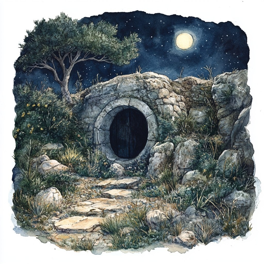 Создано на основе запроса: a loose watercolor illustration of an ancient Isreali cave tomb is set in a rocky, bushy, hillside