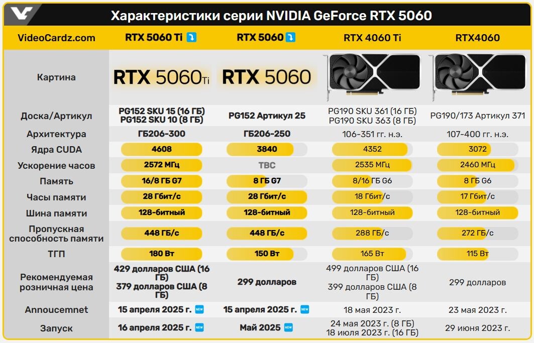 Кроме того, компания подтвердила выпуск бюджетной версии GeForce RTX 5060 на базе GPU GB206-250 с объёмом памяти 8 ГБ (используется память стандарта GDDR7) и уровнем энергопотребления 150 Вт. Её стоимость составит $299, а релиз запланирован на май текущего года.