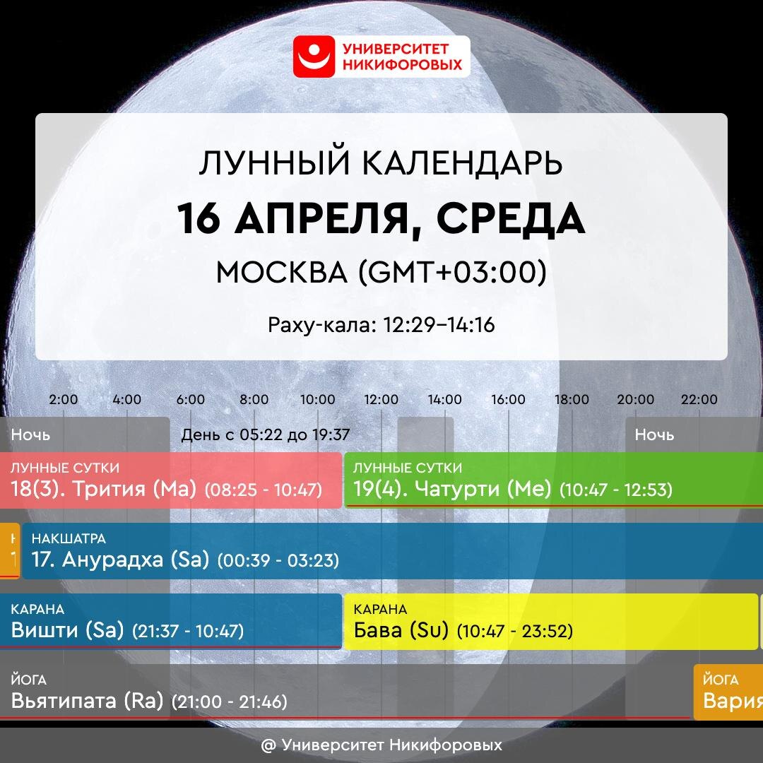 16 АПРЕЛЯ, СРЕДА Энергетика дня противоречивая, преимущественно неблагоприятная. До 10:47 повышен риск интоксикаций, да и в целом весь день не поддержит конструктивную и созидательную деятельность. Это делает день в большей степени подходящим для духовных, нежели для материальных задач. Энергиям дня соответствуют медитации и спокойные размышления, сегодня стоит полагаться не столько на логику и анализ, сколько на интуицию и эмоционально-чувственное восприятие реальности. Возможны эмоциональные качели, позаботьтесь о себе: постарайтесь сознательно избегать эмоционально заряженного контента, не включайтесь в истощающее вас общение, найдите возможность хотя бы немного побыть в уединении, сделать паузу на чай или время от времени выпивать несколько глотков чистой воды. С 10:47 включается энергия “пустых рук”, которая поддерживает такие дела как очищение, избавление от ненужного, а также отдавание, благотворительность, помощь другим. Благоприятно читать мантру Ганеше, угощать кого-то фр