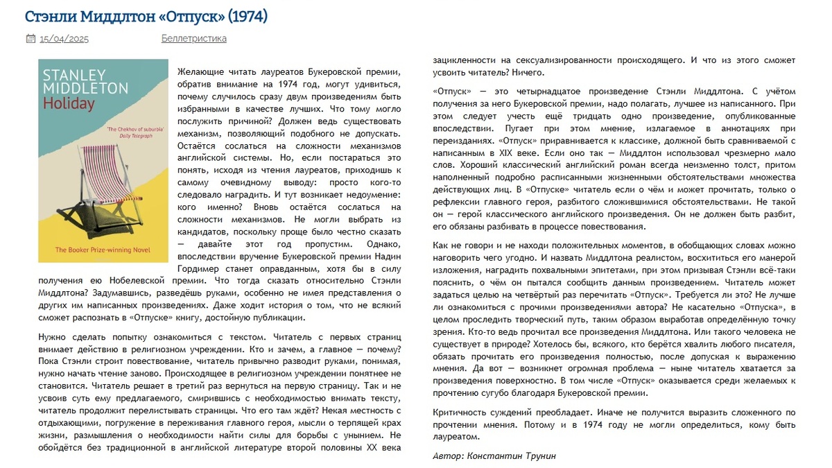 Стэнли Миддлтон "Отпуск" (1974) | Критика