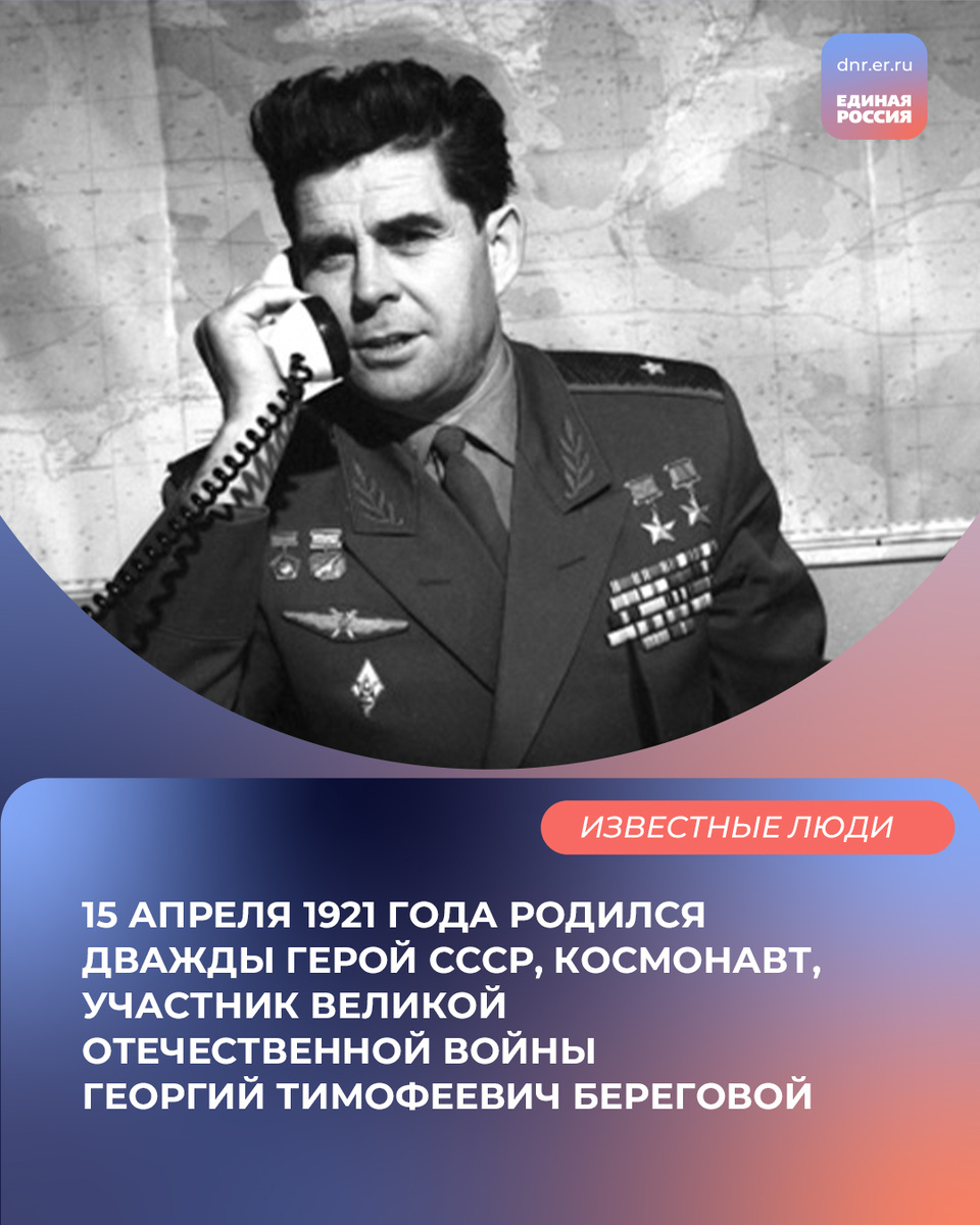 15 апреля 1921 года на Полтавщине родился дважды Герой СССР, космонавт, участник Великой Отечественной войны Георгий Береговой. Вскоре семья перебралась в Енакиево, где и прошло детство Георгия Тимофеевича. В юности особое место в жизни нашего земляка занимал енакиевский аэроклуб. Там он совершил и свой первый полет – на учебном самолете У-2. Так была проложена дорога в небо, а затем и в космос. В 1938 году 17-летним юношей Георгий ушел служить в Красную армию, получил направление в Ворошиловградскую школу военных летчиков имени Пролетариата Донбасса. К июню 1941 года закончил обучение и стал летчиком бомбардировочной авиации. Принимал участие в Курской битве, а потом освобождал Украину, Польшу, бился в небе Трансильвании и Венгрии, Чехословакии и Австрии. В 1944 году был удостоен высшей награды – звания «Герой СССР». После войны Георгий Тимофеевич занимался наукой – служил в Государственном краснознаменном научно-испытательном институте ВВС, был летчиком-испытателем, а затем попал в к