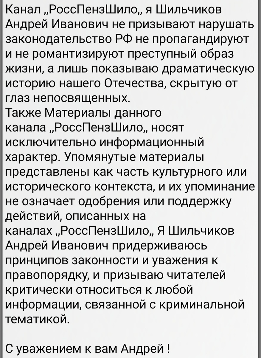 Канал ,,РоссПензШило,, я Шильчиков Андрей Иванович не призывают нарушать законодательство РФ не пропагандируют и не романтизируют преступный образ жизни, а лишь показываю драматическую историю нашего Отечества, скрытую от глаз непосвященных. Также Материалы данного канала ,,РоссПензШило,, носят исключительно информационный характер. Упомянутые материалы представлены как часть культурного или исторического контекста, и их упоминание не означает одобрения или поддержку действий, описанных на каналах ,,РоссПензШило,, Я Шильчиков Андрей Иванович придерживаюсь принципов законности и уважения к правопорядку, и призываю читателей критически относиться к любой информации, связанной с криминальной тематикой. С уважением к вам Андрей !