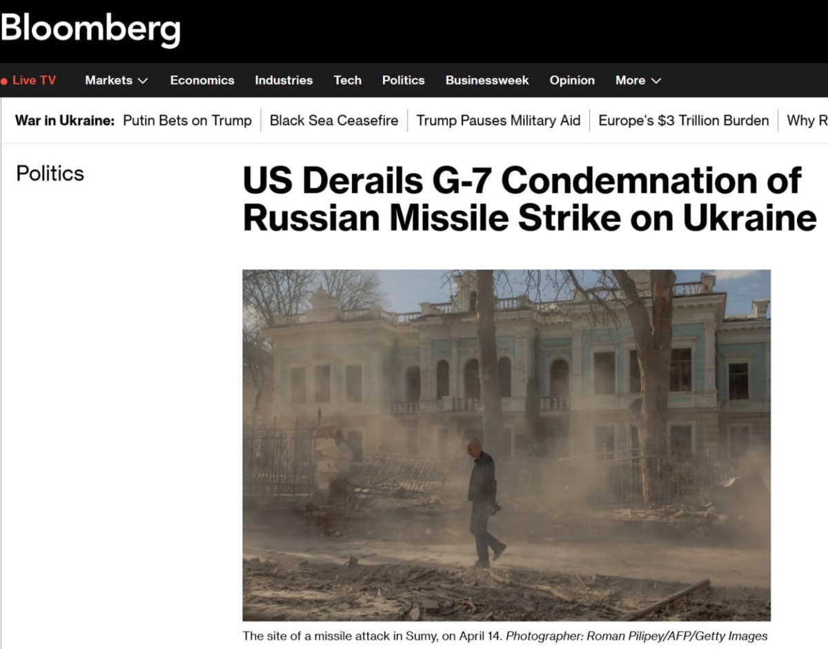 Bloomberg: США заявили союзникам по G7, что не поддержат заявление, осуждающее самую смертоносную атаку России на Украину в этом году, поскольку они хотят продолжить переговоры с Москвой в нужном русле. Администрация президента Дональда Трампа заявила союзникам, что не может подписать заявление, осуждающее нападение, поскольку она “работает над сохранением пространства для мирных переговоров”, по словам людей, знакомых с дипломатической перепиской, поскольку встречи между Белым домом и Кремлем продолжаются. По словам тех же людей, Канада, которая в этом году председательствует в G7, заявила союзникам, что без одобрения США было бы невозможно выступить с заявлением. Согласно черновикам, с которыми ознакомилось агентство Bloomberg, в заявлении G7 планировалось заявить, что нападение на Сумы стало доказательством того, что Россия полна решимости продолжать войну. ℹ️ Уиткофф, в интервью FOX News, положительно отозвался о результатах переговоров с Путиным 11 апреля. Wall Street Journal