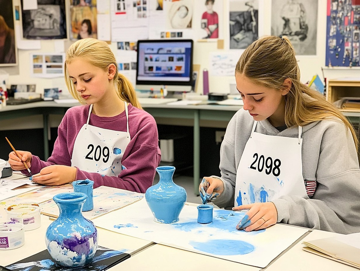 Создано на основе запроса: Two teenage students in an art class, sitting at a table with paper and paintbrushes on it, creating small blue vases out of clay using glaze paint, wearing aprons over their school uniforms that say "2098" written across them. There is also artwork displayed behind them on the wall, showing how to create these murals with a white background. On one desk, there's a computer screen showing a photo album. The two girls have blonde hair, and they look focused, as if immersed in the painting. --- Автоперевод: Два ученика -подростка в художественном классе, сидя за столом с бумагой и кистями, создавая маленькие голубые вазы из глины, используя краску глазурь, носят фартуки над своей школьной формой, в которой написано «2098», написанные на них. Хорошо получилось? 🤔 https://dzen.ru/id/65c0c65c86e4f837c27b24d7 #ИИ #AI #нейросеть #midjourney #art