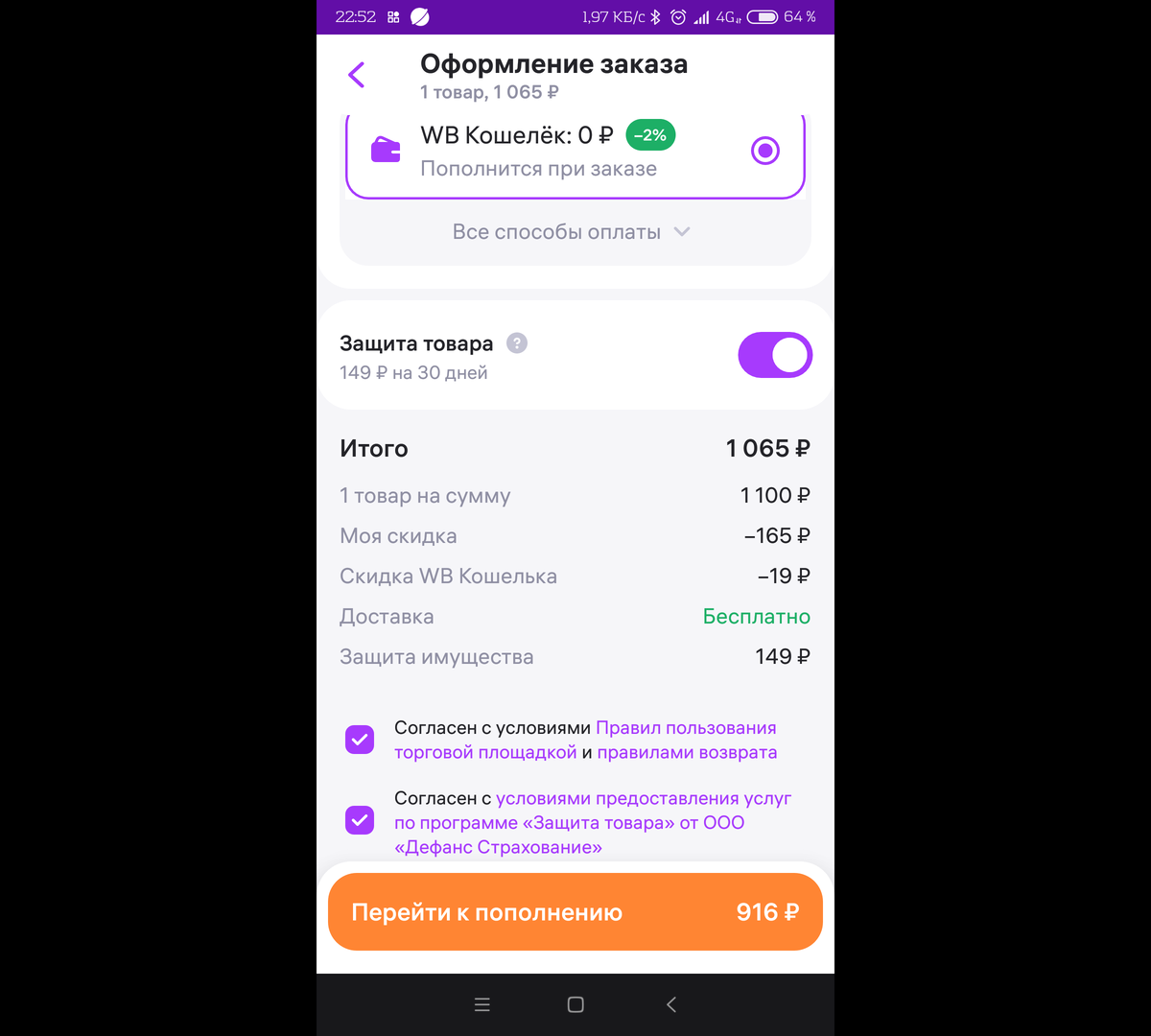 Если вы когда-нибудь пользовались маркетплейсом Wildberries, то, возможно, вы при оформлении заказа замечали кнопку "Защита товара". Стоит эта услуга (по данным на июль 2025 года) всего 149 рублей в месяц. В этой статье мы рассмотрим, что это за услуга и как не переплатить, если в ней нет необходимости? Нужно ознакомиться с информацией об этой услуге в приложении или на официальном сайте Wildberries. Выясняется, что это страхование товаров, которое подразумевает выплату до 30 тысяч рублей в случае поломки или кражи товаров, купленных на Wildberries. Данная услуга предоставляется по программе "Защита товара" от ООО "Дефанс Страхование" и включается в стоимость заказа. Лично я редко пользуюсь Wildberries и не сталкиваюсь с такими ситуациями, поэтому не подключаю данную услугу. А зачем, если товары по браку можно вернуть с возвратом денег, не забирая из пункта выдачи заказов? Можно, конечно, подключить, если вы часто покупаете товары на Wildberries и боитесь того, что товар украдут при