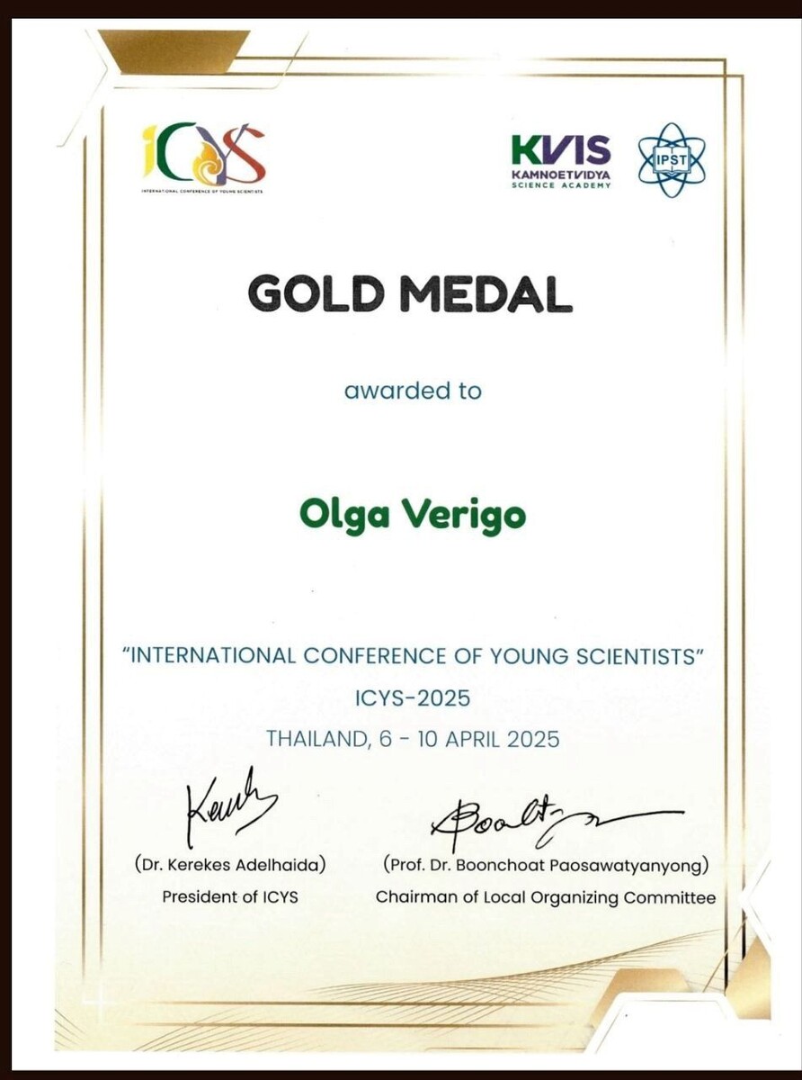 ✨ Победы на ICYS, ставшие уже традицией 📍 В городе Районг (Таиланд) состоялась 31-я международная конференция молодых ученых (ICYS) c 6 по 10 апреля. 🥇 Ее участница, ученица 11 класса Гимназии №71 г. Гомеля Ольга Вериго, завоевала золотую медаль. Работа Ольги, выполненная под руководством доцента кафедры алгебры и геометрии В. И. Мурашко и зам. директора по учебной работе гимназии И. Н. Гончаренко, была посвящена подсчёту числа графических паролей, выдерживающих ряд симметрий. ✍️ Высокому результату предшествовало более 5 лет упорного изучения математики Ольгой на повышенном уровне в гимназии и филиале. Ольга является уже не первой ученицей В. И. Мурашко, завоевавшей награду на этом конкурсе. 🖇️ Успех школьников связан с их тесным взаимодействием с сотрудниками СНИЛ «Алгебра и геометрия сложных систем» кафедры алгебры и геометрии.