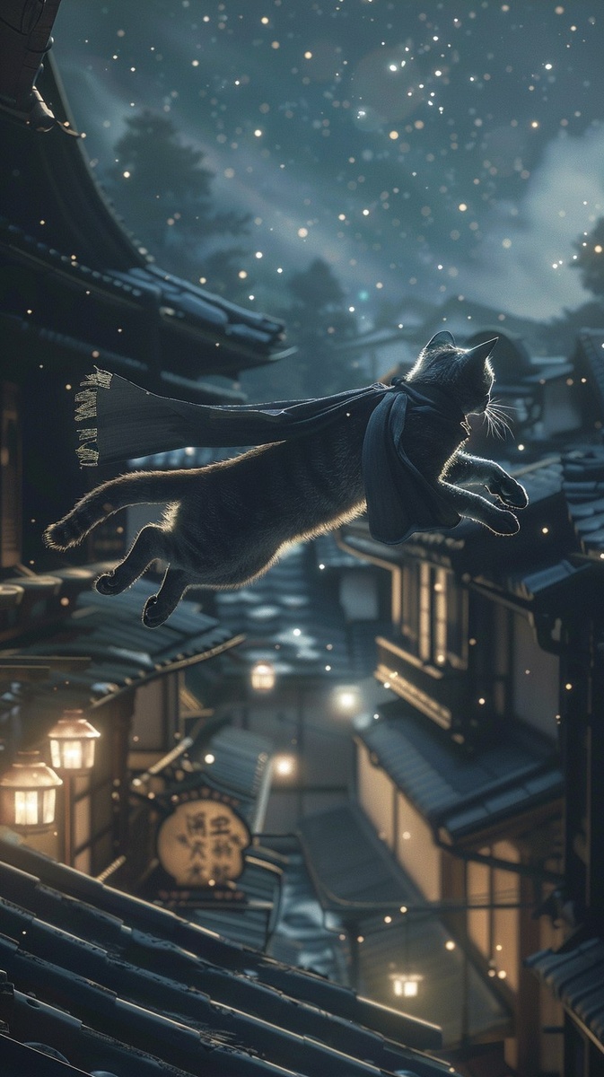 Создано на основе запроса: Photoreal ninja cat leaping silently across Edo-style rooftops at night, detailed motion blur, scarf trailing